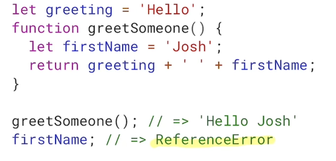 함수를 호출한 greeSomeone()은 'Hello Josh'를 호출 하지만, firstName;은 에러가 뜹니다.