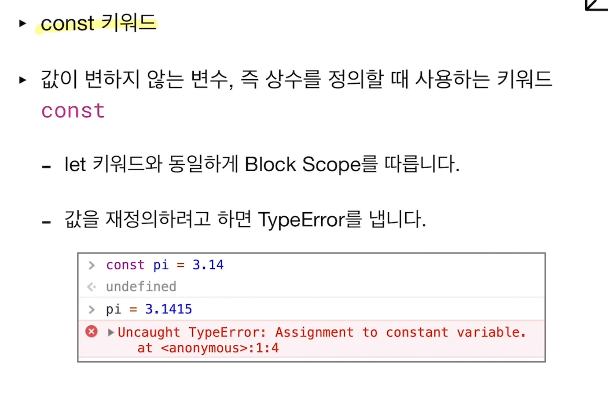 const를 초기 선언 하면 값을 변경 할수 없다. !!! (재정의 불가능)