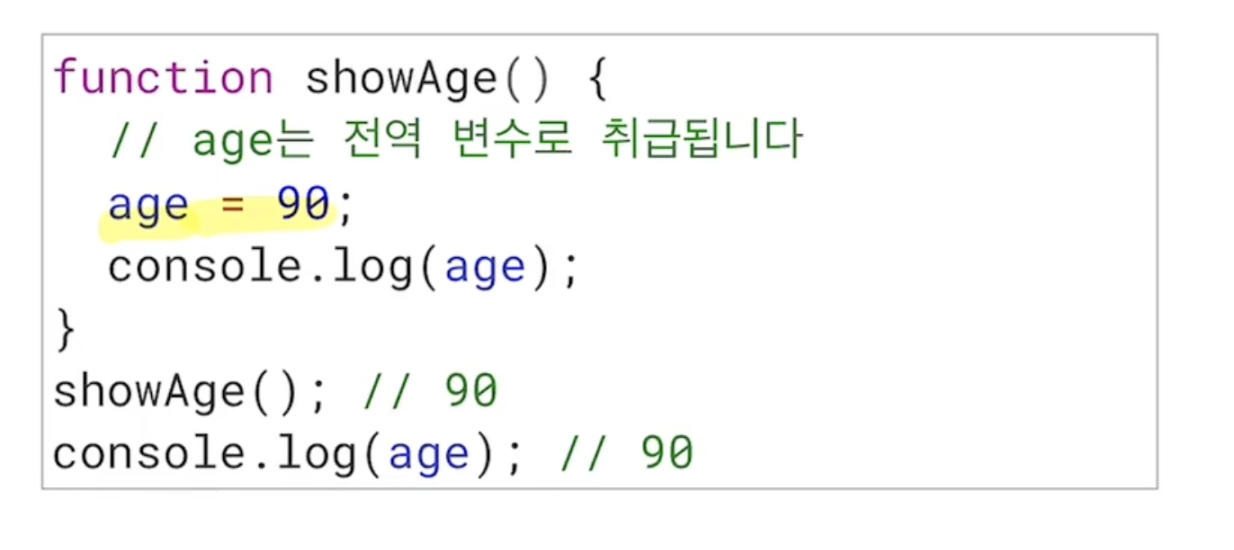 let, var, const로 선언하지 않으면 전연변수가 되어 Block을 벗어나서 전역에서 사용가능해진다.