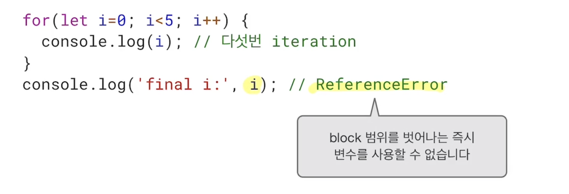 let i 가 for문 안에서 선언되고 중괄호 {} 를 벗어 낫으므로 중괄호 밖에서는 사용이 불가 하다.