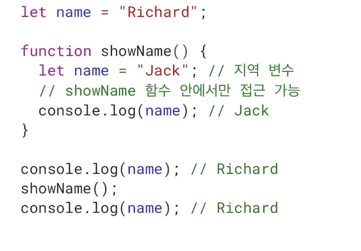 함수를 호출 할때만 함수 안에 있는 전역 변수인 name(Jack)이 출력되고, 함수 출력이 아닌 name을 호출 할때는 전역변수에 선언되어 있는 name(Richard)가 출력된다. !