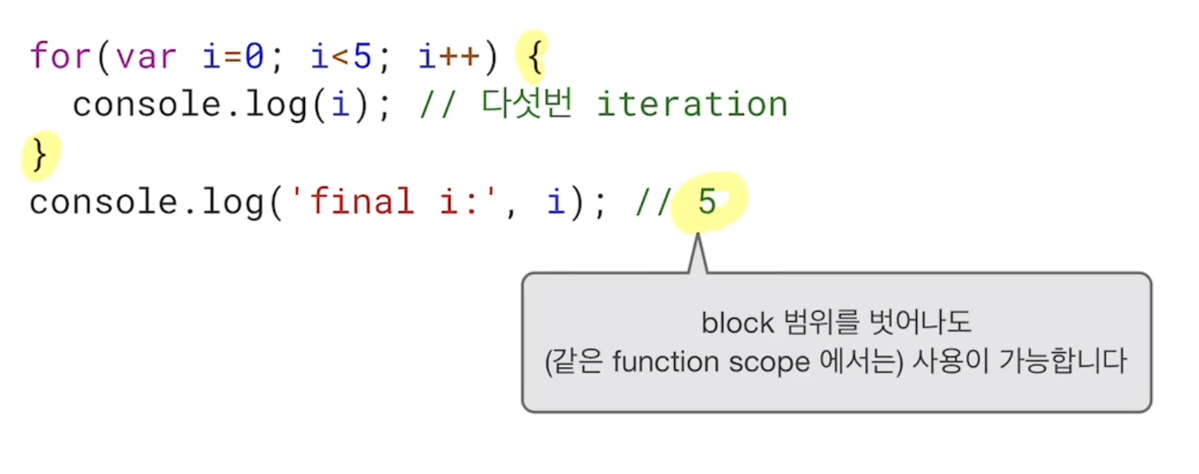var i는 중괄호 {}를 벗어 나도 계속 사용이 가능하다.