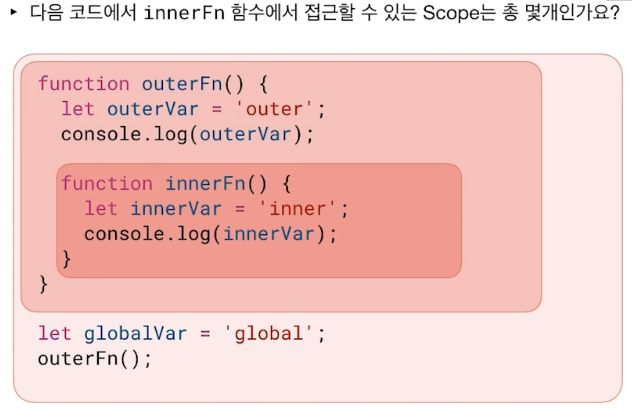 -> 2번 : outer 이 출력된다. // outerFn(); 할경우 outerFn이 출력되고 innerFn은 그냥 리턴된다. 근데 그것을 innerFn변수에 담으면 리턴 innerFn은 리턴되지 않는다.