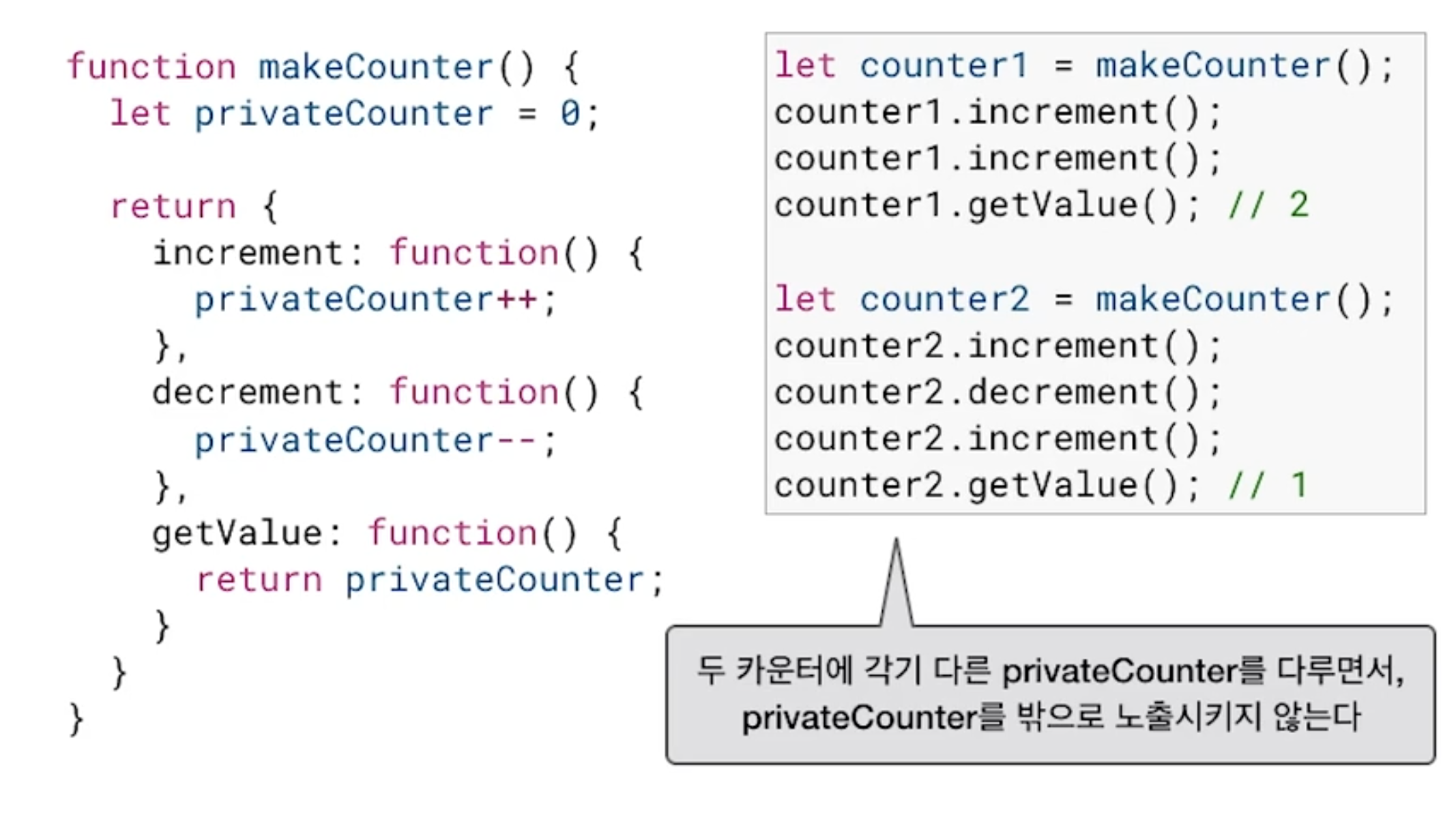 -> 객체를 사용 하는것과 비슷하다. counter1 에 makeCounter()을 초기화 하고 , 변수counter1.increment();를 하면 객체에 키 값을 불러오듯 privateCounter ++ 값을 실행한다. 두번 실행하고 리턴하는 키 getValue를 counter1.getValue();를 하면 위에서 두번 ++ 했으로 최종값 2 출력이된다.