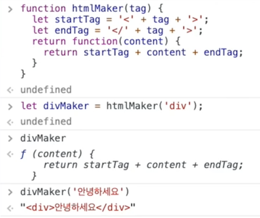 -> 1번 : outer 와 inner이 출력된다. // ()()괄호가 두개 이면 바깥함수와 안쪽 함수 둘다 호출 하는것이다.