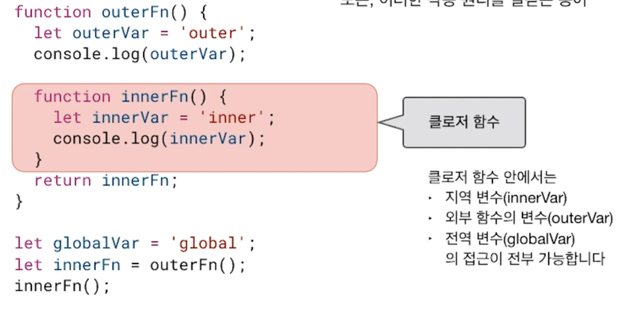 ->함수 outerFn(); 호출 하면 먼저 console.log(outerVar)먼저 해주고, 실행되지 않은 innerFn함수를 리턴합니다.