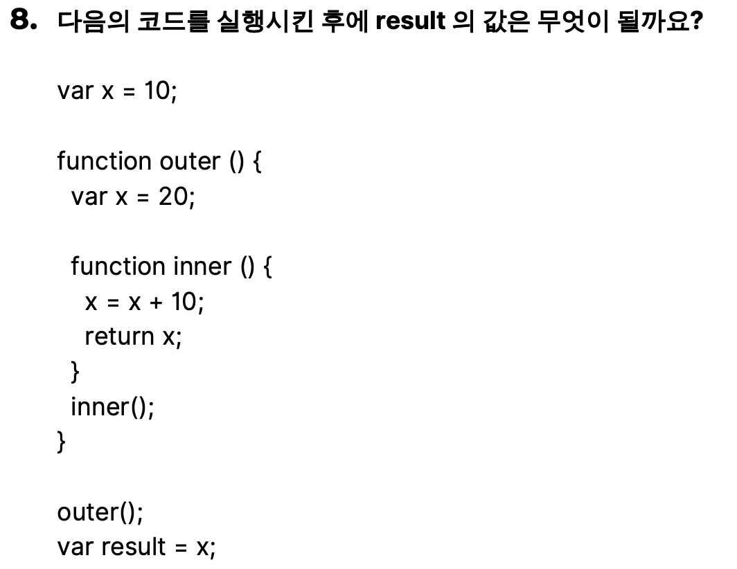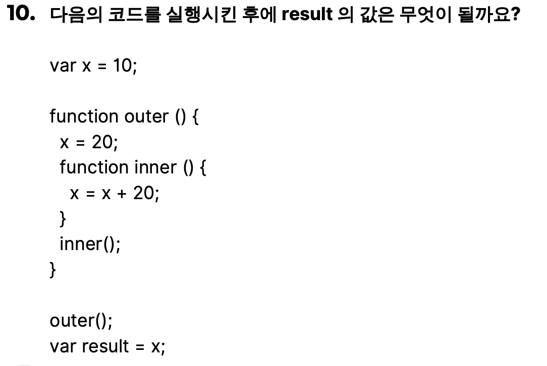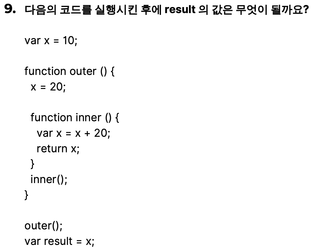 8번과 비교 하여 다른점은 outer()함수에서 x값을 재할당 하고 있다는점 그래서 전역에 있는 변수 x는 20으로 값이 재할당 되었다. 그리고 inner()안에 이는 var x = x+ 20은 x 값을 선언하고 있기에 재할당이 아니므로 전역에 있는 x 값에 영향을 주지 않음 그러므로 최종 x 값은 20 이다.