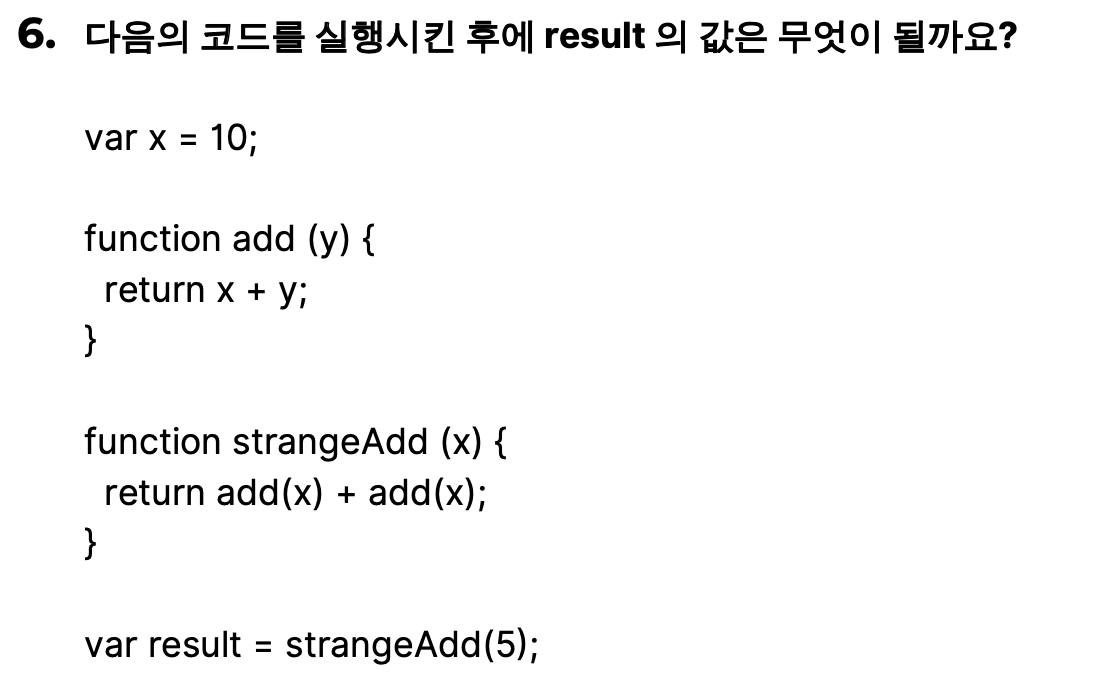 최종 result의 값은 strangeAdd(5)이다. 일단 먼저 strangeAdd(x)값에 매개변수 5를 넣어서 실행하면 , 이번엔 return add(x) + add(x)를 해야한다.