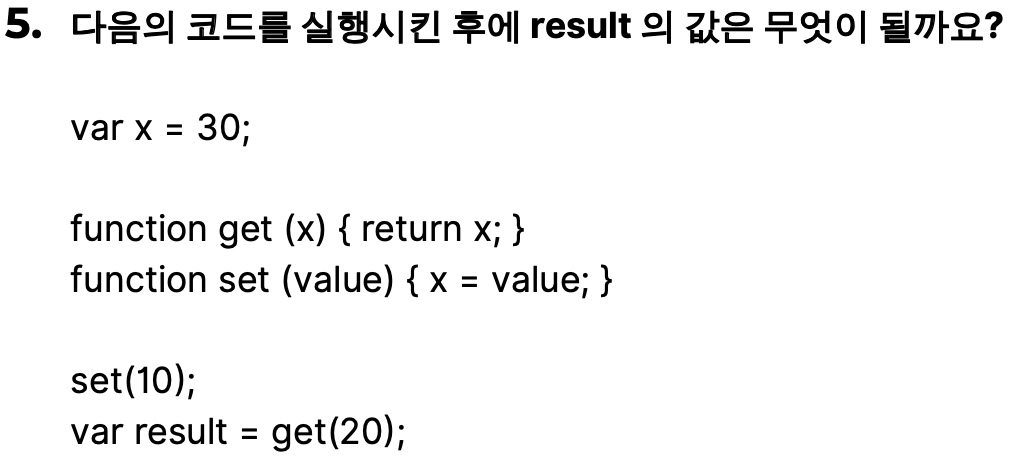 4번과 비교 하여 get(x) 함수는 매개변수 x값을 받고 있다. 그래서 함수 set(10)을 실행 한것과는 상관없이