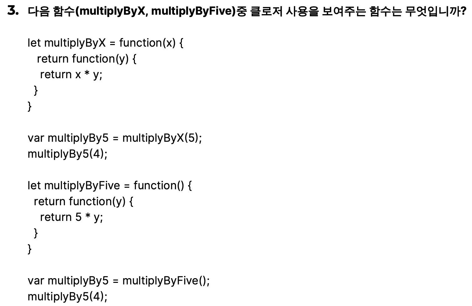 -> 익멱의 내부 함수는 reuturn x*y를 하면서 x의 값을 외부에서 가져오고 있다. 그래서 클로저 이다.